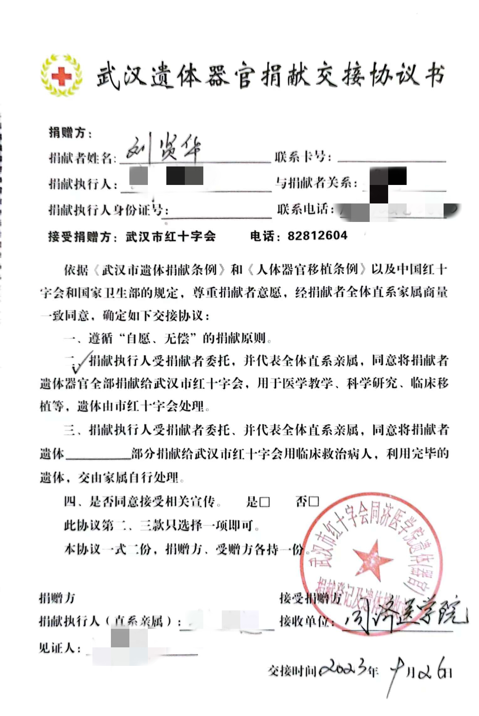 2023年9月26日,劉賢華因病與世長辭,享年58歲。劉賢華的兒子尊重母親的遺愿,忍住萬分悲痛,將其遺體捐獻給武漢市紅十字同濟醫學院,角膜捐獻給武漢市紅十字愛爾眼庫。初步評估,劉賢華角膜質量符合臨床移植條件,至少可以幫助一位角膜盲癥患者重見光明。