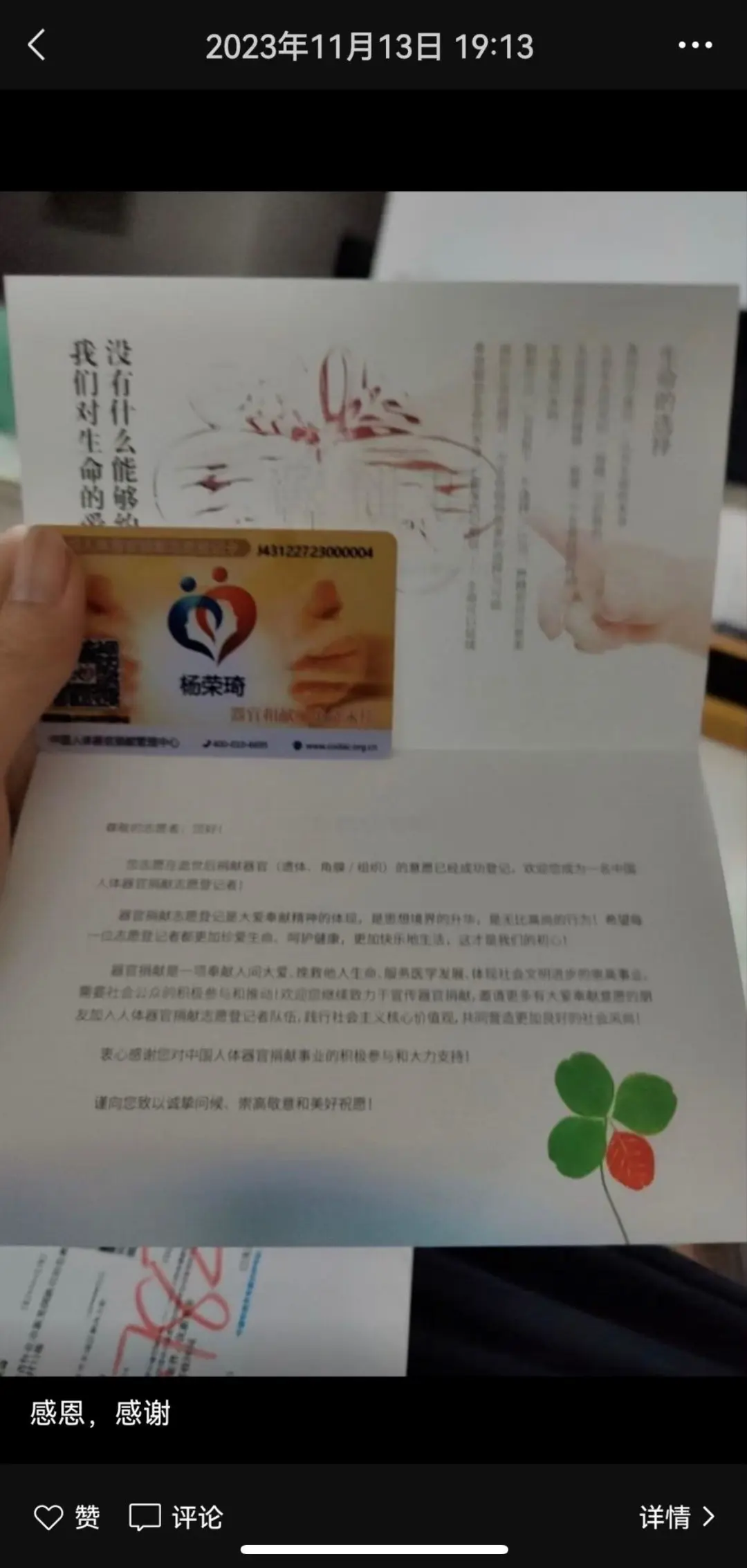 2023年11月13日晚上7點(diǎn)13分,懷化市新晃縣27歲的在讀研究生楊榮琦,發(fā)出了他人生的最后一條朋友圈“感恩、感謝”,配圖是他申請的“中國人體器官捐獻(xiàn)志愿登記卡”。